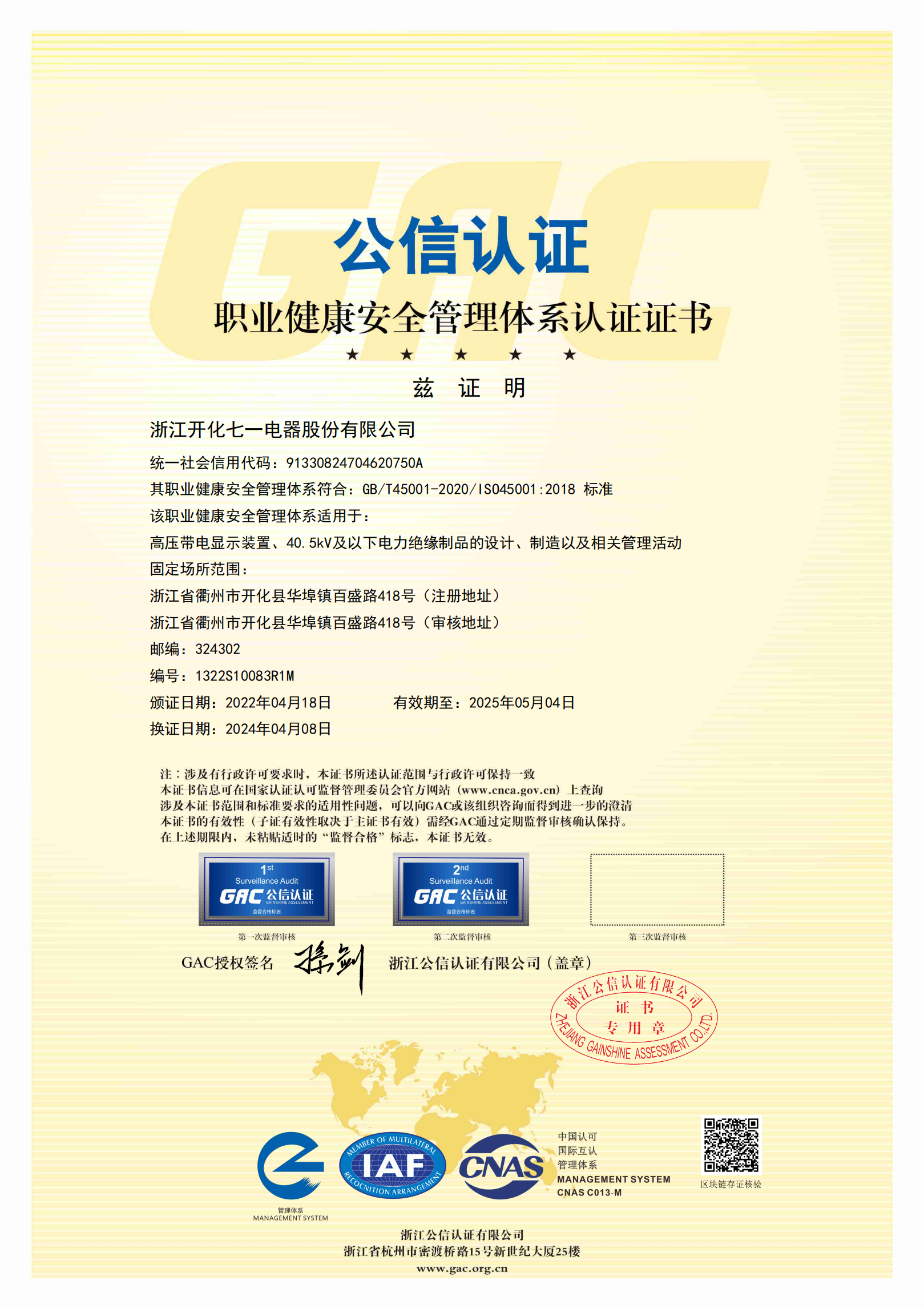 ISO45001:2018 ISO45001:2018七一電器還獲得了職業(yè)健康與安全的ISO 45001:2018認證,為企業(yè)提供了科學有效的職業(yè)健康安全管理體系規(guī)范和指南,提高職業(yè)健康安全管理水平。